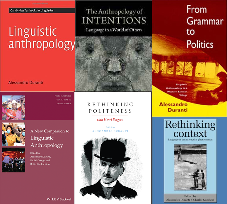 Alessandro Duranti is Distinguished Research Professor of Anthropology, former Chair of Anthropology (2007-2009), and former Dean of Social Sciences at UCLA (2009-2016). His research projects have focused on the distinctive role of verbal, visual, and aural communication in political arenas, everyday life, and jazz performance. Theoretically, he has been interested in agency, intentionality, and intersubjectivity, with a special attention given to the tension between plans and improvisation. Methodologically, he has favored participant-observation and audio-visual recordings of spontaneous interaction in Samoa, the US, France, and Italy. His books include The Samoan Fono: A Sociolinguistic Study (Pacific Linguistics Monographs, 1981), Rethinking Context: Language as an Interactive Phenomenon (co-edited with C. Goodwin, Cambridge 1992), From Grammar to Politics: Linguistic Anthropology in a Western Samoan Village (University of California Press, 1994), Linguistic Anthropology (Cambridge University Press, 1997), A Companion to Linguistic Anthropology (Blackwell 2004), Handbook of Language Socialization (co-edited with E. Ochs and B.B. Schieffelin, Wiley-Blackwell 2012), The Anthropology of Intentions: Language in a World of Others (Cambridge University Press, 2015), Rethinking Politeness with Henri Bergson, Oxford University Press, 2022, and A New Companion to Linguistic Anthropology(co-edited with Rachel George and Robin Conley Riner, Wiley 2023). Duranti is co-founder (with Bambi B. Schieffelin) of the journal Pragmatics (formerly IPrA Papers in Pragmatics), former editor of the Journal of Linguistic Anthropology (1999-2001), and past President of the Society of Linguistic Anthropology (1997-1999). In 1999, he received the John Simon Guggenheim Fellowship, the UCLA Alumni Distinguished Teaching Award, and the American Anthropological Association/Mayfield Award for Excellence in Undergraduate Teaching. In 2008, he was elected Fellow of the American Academy of Arts and Sciences.